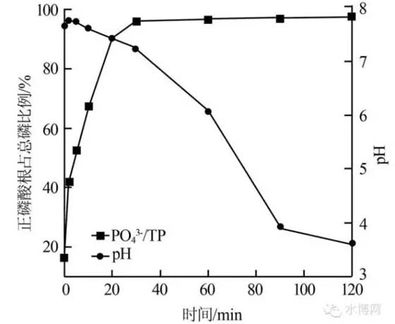 實驗水質同2.2,考察臭氧投加質量濃度為96mg/L時,廢水中正磷酸鹽占總磷比例和pH隨時間的變化趨勢,結果如圖3所示。